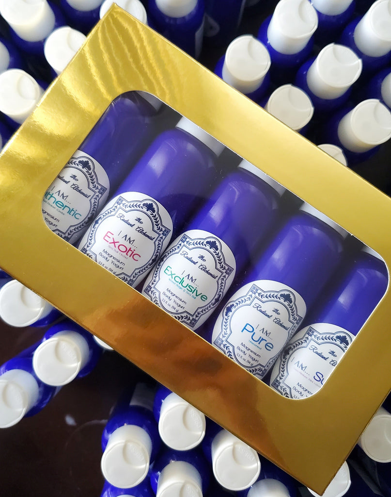 A complete set of 5 travel sized (TSA friendly 3.3oz/94g) magnesium lotions - one of each of our signature scents - Exotic, Authentic, Exclusive, Sultry, and BONUS: Pure (unscented).